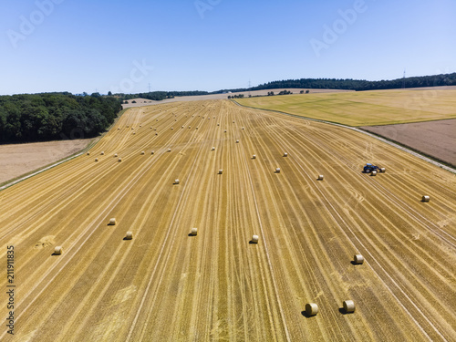 Deutschland, Hessen, Wetterau, Region Wöllstadt, abgemähtes Getreidefeld, mit Strohballen, Luftaufnahme