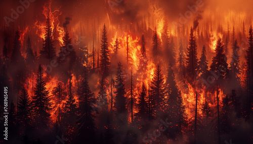 Devastating Wildfire Burning Through Forest with Smoke and Flames