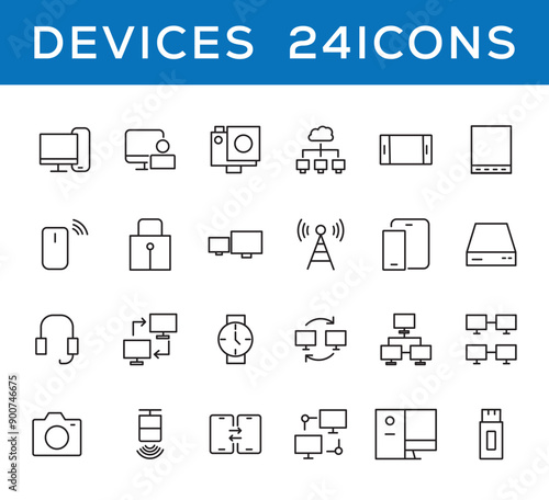 Device and technology line icon set. Electronic devices and gadgets, computer, equipment and electronics. Computer monitor, smartphone, tablet and laptop simple icon collections