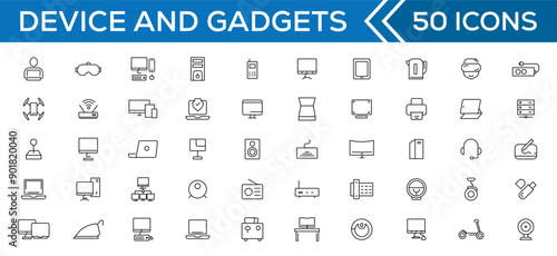 Device and technology line icon set. Electronic devices and gadgets, computer, equipment and electronics. Computer monitor, smartphone, tablet and laptop simple icon collections