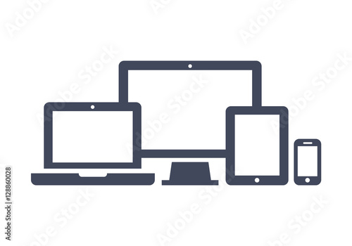 Device Icons: smart phone, tablet, laptop and desktop computer. Vector illustration of responsive web design.