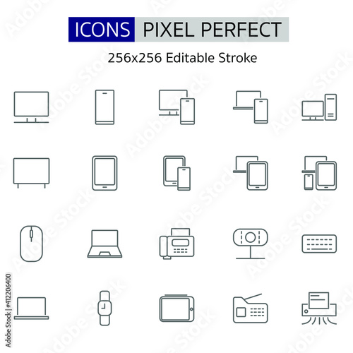 Devices line icons set. Minimal vector illustration. Simple flat sign for web, technology app. Pixel Perfect. Editable Strokes.