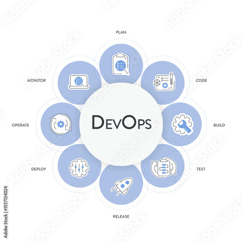 DevOps banner concept has 8 steps to analyze such as plan, code, build, operate, deploy, test, monitor and release for Software development and information technology operations. Infographic vector.