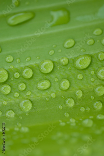 Dew drops from the mist perched on the lower surface of green banana leaves