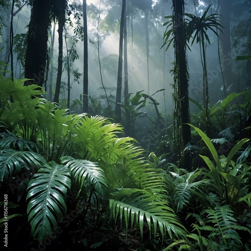 Dew-Covered Fronds of Roystonea Oleracea Shimmering in the Rainforest Mists