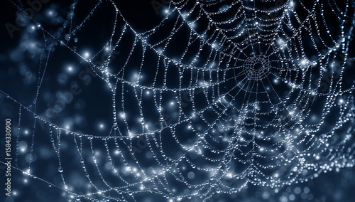 Dew-Covered Spider Web on Black Background