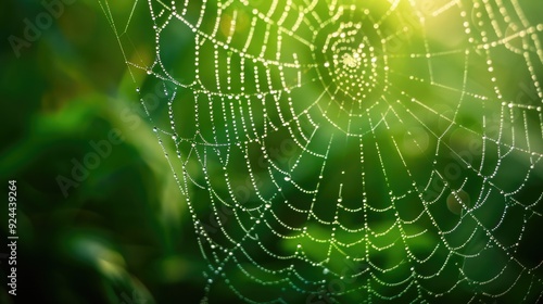 Dewdrops on spider web. Close-up of glistening silken threads against blurred green background