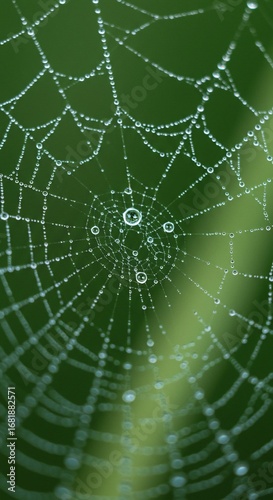 Dew-Kissed Web: A macro shot of a spider web glistening with water droplets against a vivid green background. This image captures the delicate beauty and intricate design of nature's artistry.