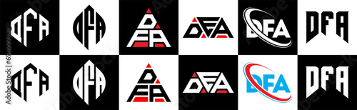 DFA letter logo design in six style. DFA polygon, circle, triangle, hexagon, flat and simple style with black and white color variation letter logo set in one artboard. DFA minimalist and classic logo