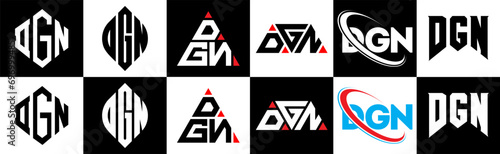 DGN letter logo design in six style. DGN polygon, circle, triangle, hexagon, flat and simple style with black and white color variation letter logo set in one artboard. DGN minimalist and classic logo