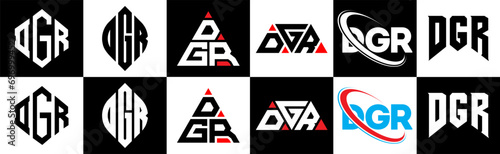 DGR letter logo design in six style. DGR polygon, circle, triangle, hexagon, flat and simple style with black and white color variation letter logo set in one artboard. DGR minimalist and classic logo