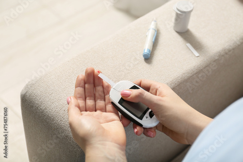 Diabetes. Woman checking blood sugar level with glucometer at home, closeup