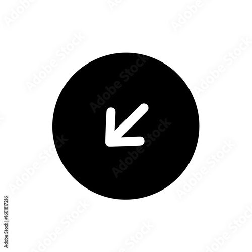 Diagonal down-left arrow icon inside solid black circle for navigation, direction, or user interface design.