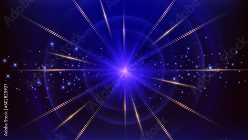 Diagonal golden lines with blue glowing circle, light beam and glitter light effects elements on dark blue background. Vector illustration