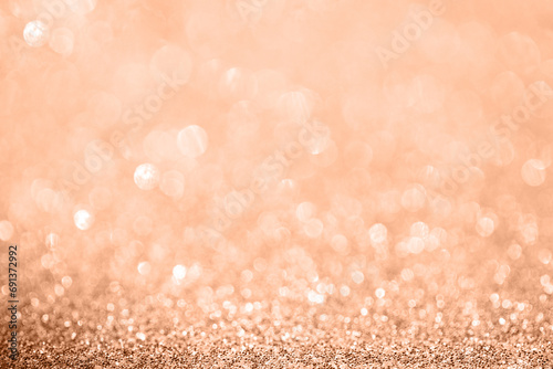 Diamond coral bokeh texture with sparkling particles festive background in color of the year 2024 Peach Fuzz