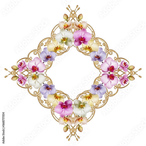 Diamond shaped floral frame with orchids and gold filigree isolated on white isolated on transparent background
