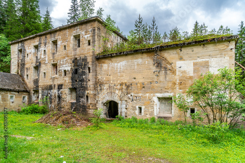 Die Überreste eines Bunkers stehen inmitten einer Waldlandschaft