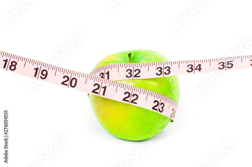Dieting. Fresh green apple and measuring tape on white background.
