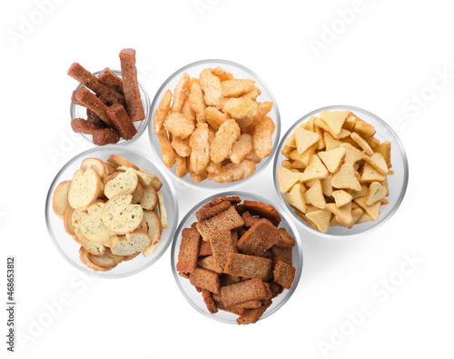 Different crispy rusks in bowls on white background, top view