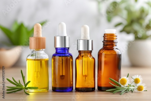 Different essential oils and herbal medicine ingredients displayed on a wooden table, promoting relaxation and well being