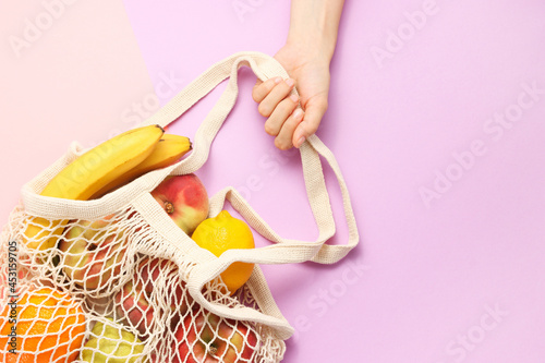 Different fruits in the reusable cotton shopping string bag with hand holding it on pink-purple background top view, eco friendly lifestyle