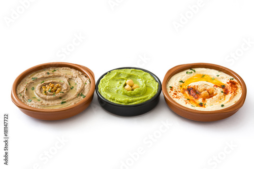 Different hummus bowls. Chickpea hummus, avocado hummus and lentils hummus isolated on white background