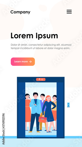 Different people lifting on elevator. Open door of office lifts with workers waiting moving inside cabin. Vector illustration for office hall, end of business, transportation concept