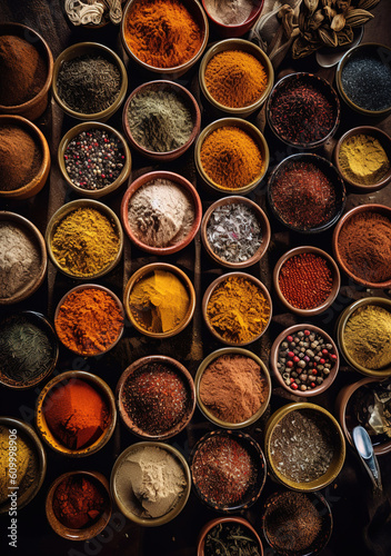 Different seasonings in cups. Spice background on the table, generative ai