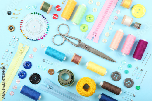 different sewing accessories on the table. Threads, needles, pins, fabric and sewing scissors close up