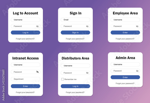 different sign in or login in boxes: customer area in two versions, employee area, intranet access, distributors area and admin area