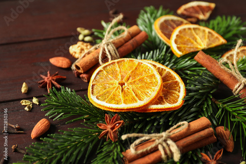 Different spices, dried orange slices and fir tree branches on wooden table, closeup. Christmas season