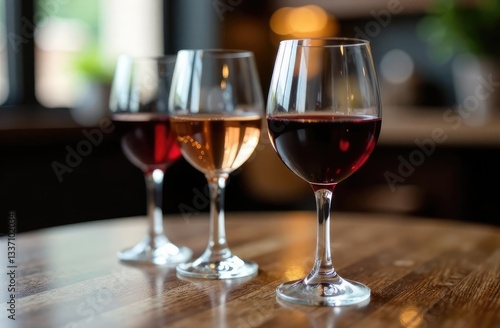 Different tasty wines in glasses on table indoors, selective focus