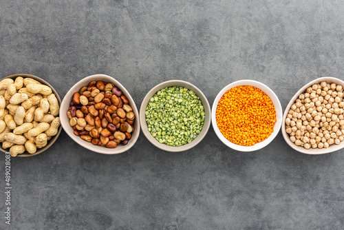 Different types of legumes in bowls, green peas and chickpeas , beans and peanuts and lentils, top view, copy space
