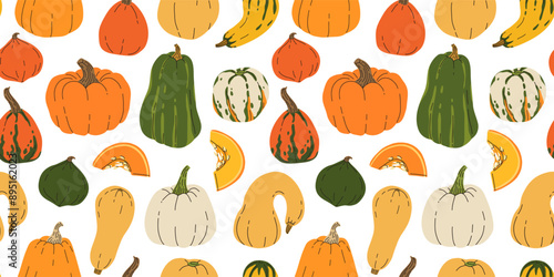Different types of pumpkins vector seamless pattern isolated on white background. Various autumn pumpkins big collection hand drawn in flat style. Thanksgiving Halloween holiday cute illustration