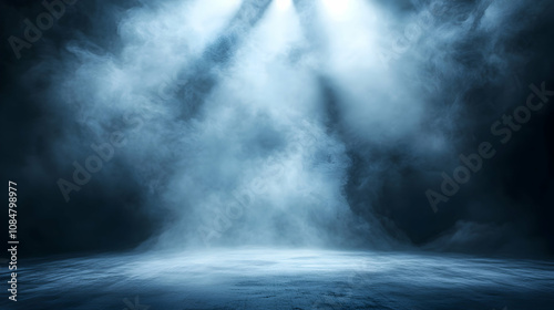 Digital 3D Rendering of a Dark Blue Smoky Stage Background with Spotlights