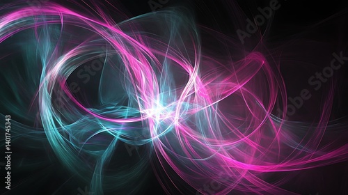 Digital abstract art featuring swirling lines and luminous shapes in shades of pink and blue against a dark background, evoking a sense of motion and energy