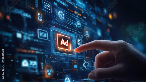 Digital advertising concept with a glowing ad button on a futuristic interface, depicting online marketing, pay-per-click advertising, and data-driven promotional strategie