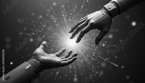 Digital Age Collaboration: AI & Human Integration: Abstract backgrounds showcasing energy flow between human and robot hands, ideal for themes of future tech and automation solutions.