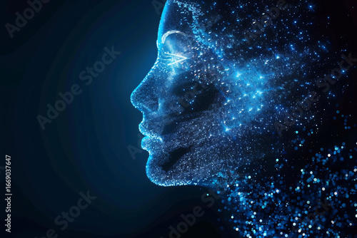 Digital AI Human Face Profile of Glowing Blue Particles Representing Consciousness and Technology
