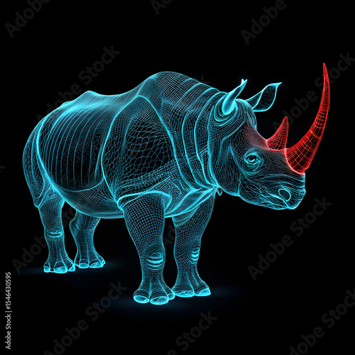 Digital anatomy illustration of a whole rhino in grayscale, highlighting muscle structure and bone details with a scientific and realistic approach.