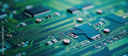 Digital art 3D illustrated Printed Circuit Board on an abstract blue-green backdrop