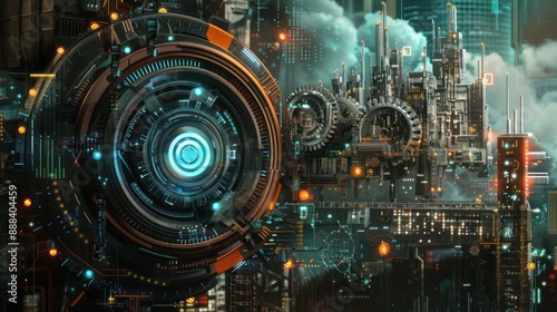 digital art piece illustrating the integration of new financial technology in a corporate setting, shown as a fusion of traditional gears and digital circuits