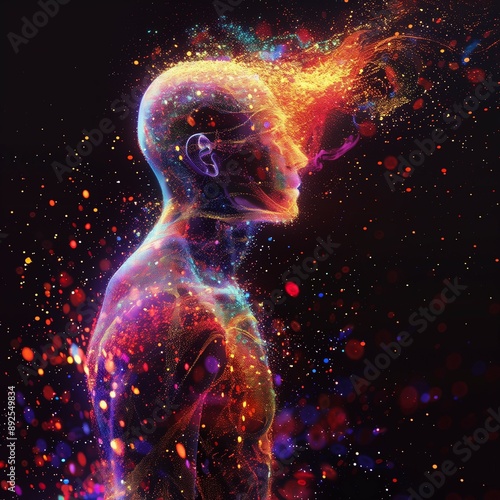 Digital artwork of a glowing human figure composed of vibrant light particles and abstract energy. Perfect for sci-fi and futuristic themed designs and visual effect.