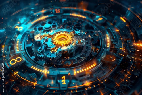 Digital artwork of interlocking gearwheels, suggesting the seamless integration of timekeeping and technological advancement