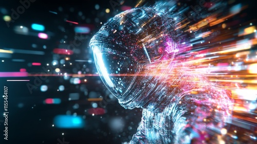 Digital astronaut traveling through a vibrant cosmic landscape in futuristic visuals