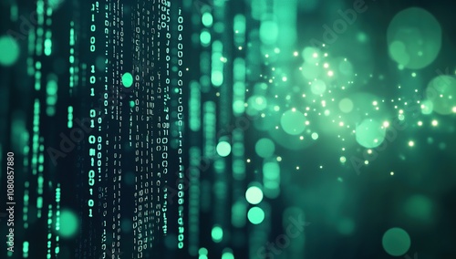 Digital background featuring green bokeh lights and binary code