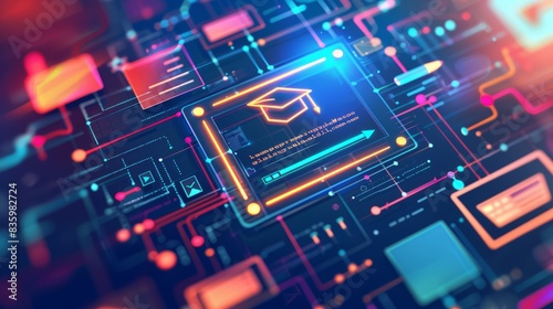 Digital background featuring icons of education and technology, such as a computer screen with academic symbols like the graduation cap or pencil on it, surrounded by digital data visualizations.