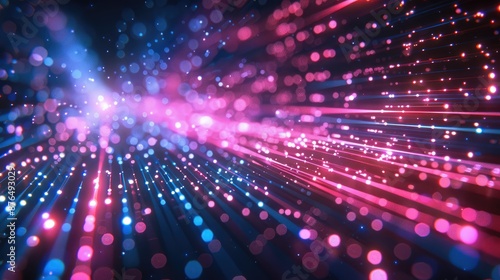Digital background featuring pink and blue glowing data stream, light streaks, and holographic elements on black background. Generative AI.