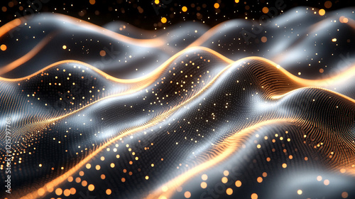 Digital background with flowing gold, silver, and white data waves glowing with light particles on a dark backdrop, featuring a modern minimalistic style and empty blank space for captions