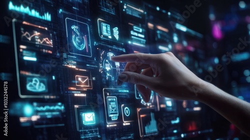 Digital Banking and Financial Technology Concept. A person presents digital banking and financial technology icons, and currency symbols, emphasizing modern online payment systems and e-commerce.